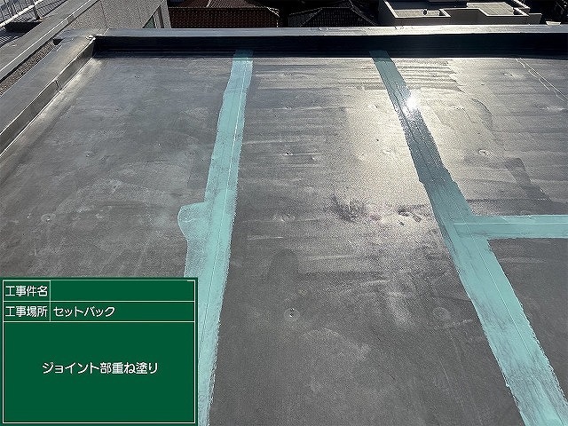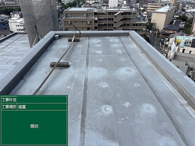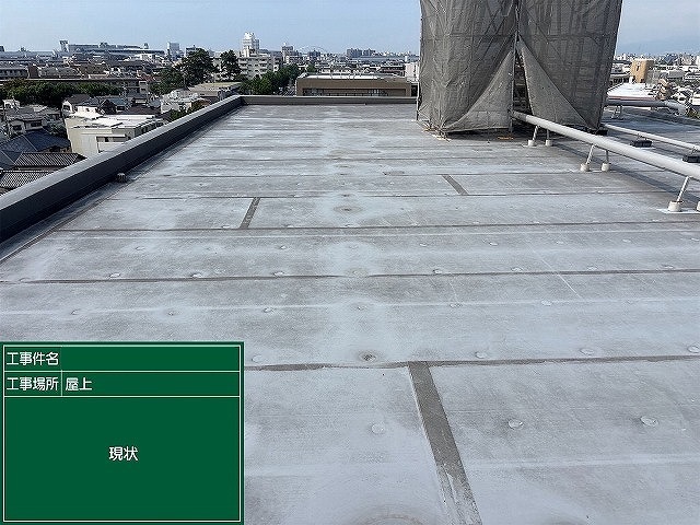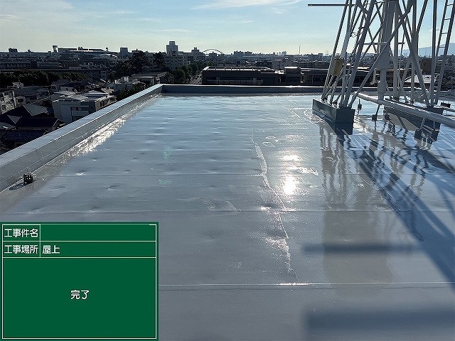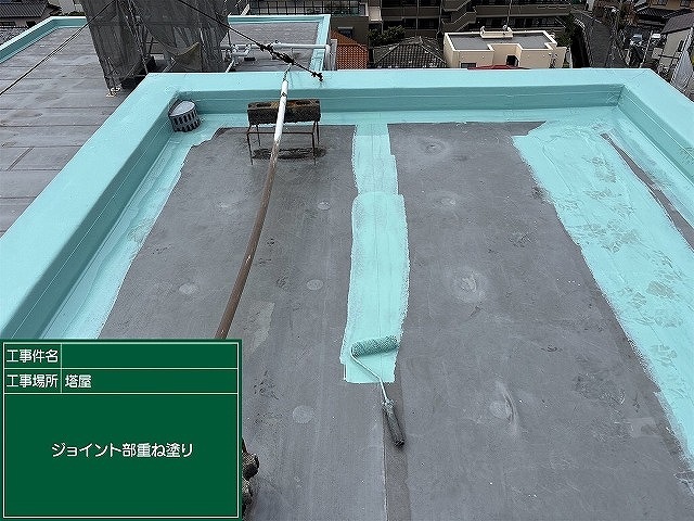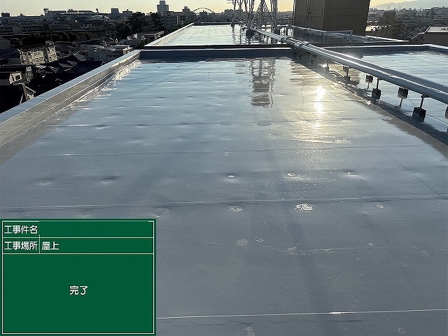 今回の現場では、下地の状態を事前に十分確認し、劣化部分の補修と下地処理を丁寧に行った上で施工を進めました。既存防水層との密着性を高めることで、防水性能の回復と耐久性の向上を図っています。