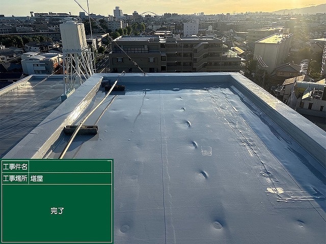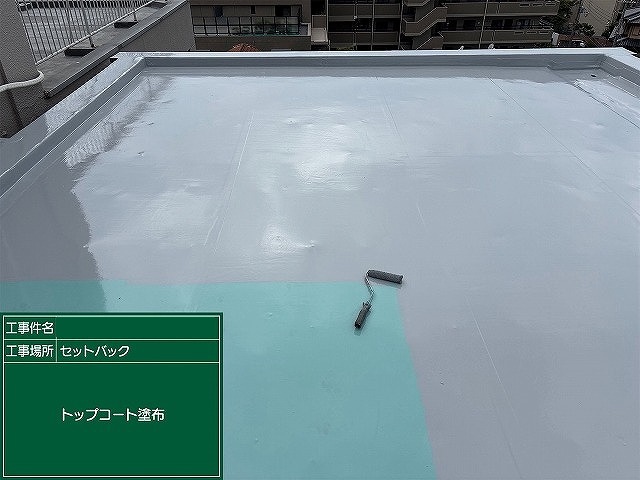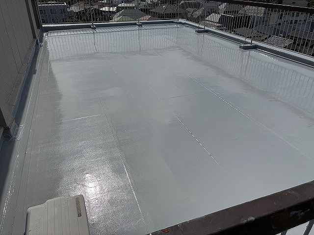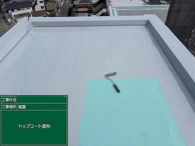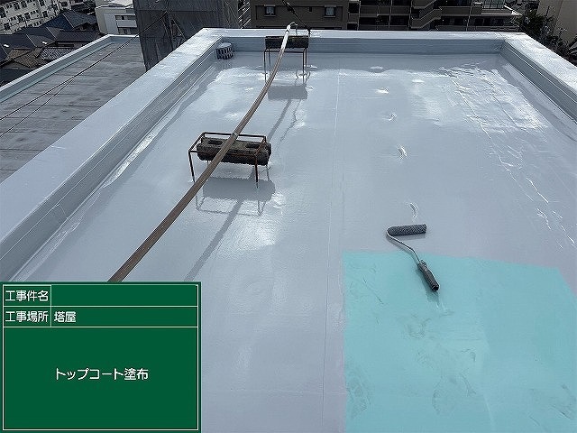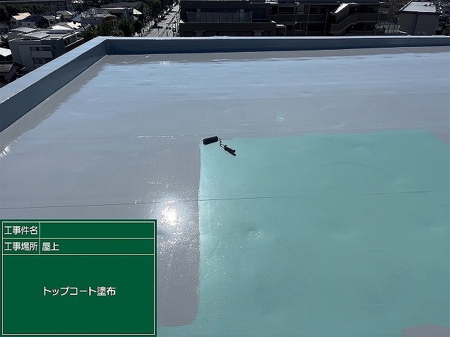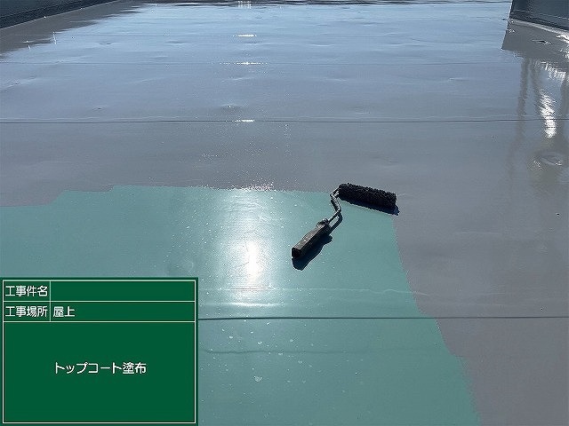 最後にトップコートを塗布し、防水層を紫外線や風雨から保護します。トップコートは防水層の劣化を抑え、耐用年数を延ばす重要な役割を担います。美観を整えるだけでなく、防水性能を長く維持するために欠かせない仕上げ工程です。