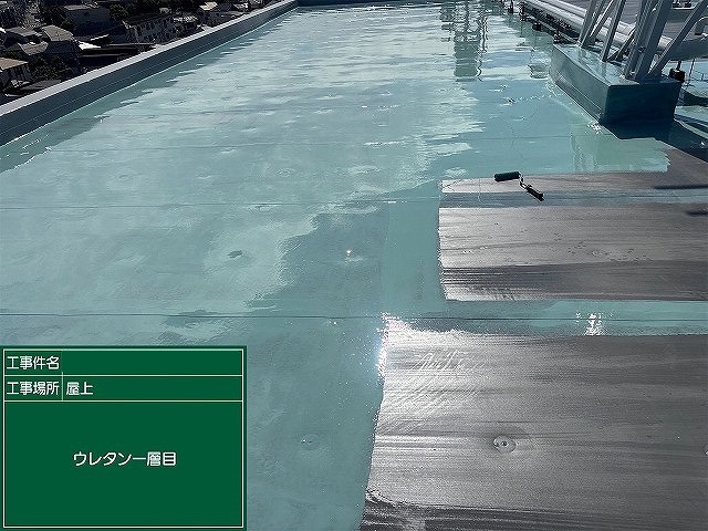 液状のウレタン防水材を塗布し、防水層の基礎となる一層目を形成します。下地の凹凸になじませながら施工し、均一な膜厚を確保することが重要です。この工程で防水層の性能の土台が決まるため、材料の配合や塗布量を管理しながら進めます。