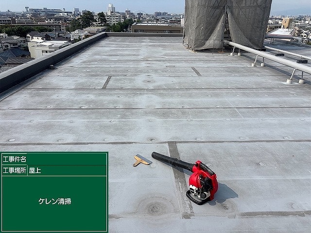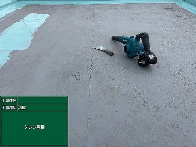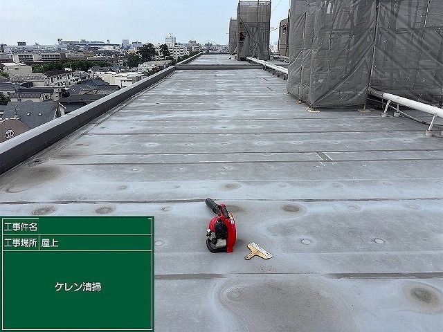 施工前に、既存防水層表面の汚れや粉化した塗膜、付着物をケレン作業により丁寧に除去します。劣化した表面をそのままにすると、防水材の密着不良や早期剥離の原因となるため、この工程は非常に重要です。下地の状態を整え、防水層がしっかりと定着する環境をつくります。