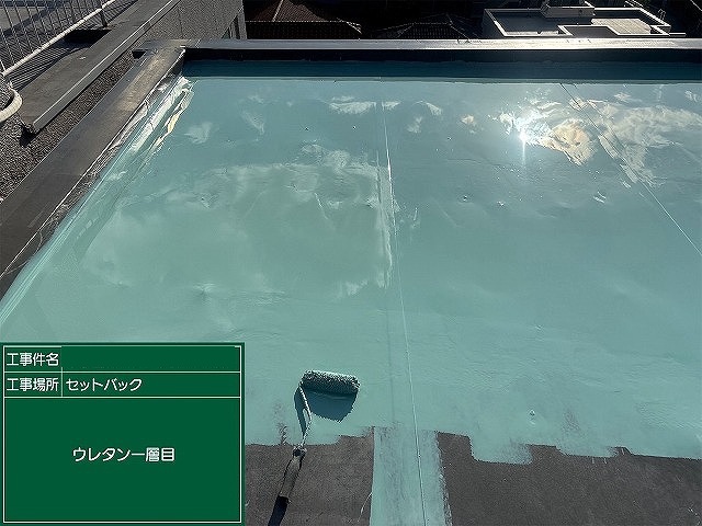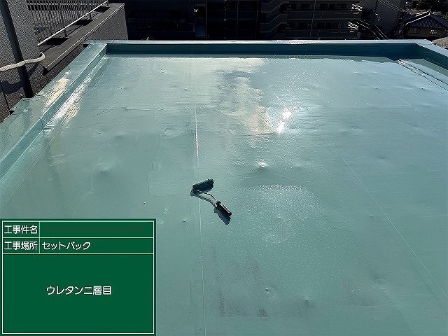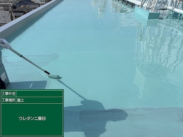 一層目の硬化を確認後、二層目を塗布し、防水層として必要な厚みと強度を確保します。二層構造にすることで、耐久性・防水性能が向上します。塗り残しや薄塗りがないよう、全体を確認しながら丁寧に仕上げていきます。