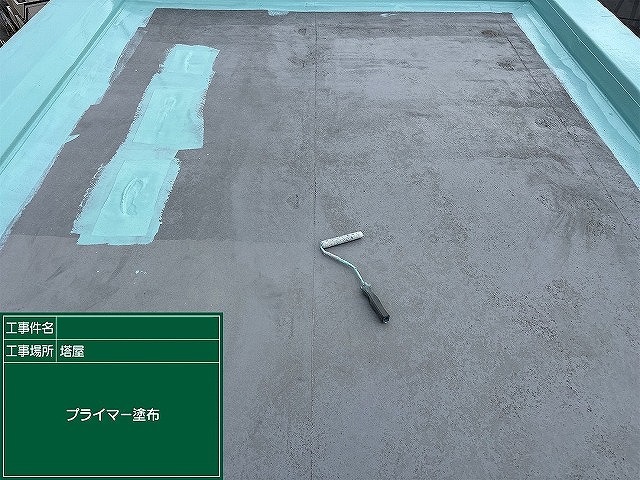 防水材を塗る前に行うのがプライマー塗布です。プライマーは下地とウレタン防水材との密着を強固に下地とウレタン防水材の密着性を高めるため、専用プライマーを均一に塗布します。塗りムラや塗り残しがあると防水層の剥がれにつながるため、細部まで丁寧に施工します。プライマーは防水層の“接着剤”の役割を果たす、重要な下準備工程です。